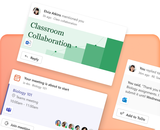하나의 계정으로 원드라이브, 팀즈 앱 등을 활용하여 협업 교실을 만들고 학생과 교사가 자유롭게 소통할 수 있습니다.